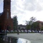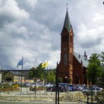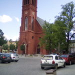 Kościół św. Kazimierza stoi właściwie jako jedna z pierzei rynku, centralnie między dwiema ścianami zabudowy, północną i południową. Ja siedzę pod zachodnią pierzeją, twarzą na wschód, czyli w stronę frontu kościoła właśnie. Z tego już wynika, że kościół jest z grubsza zorientowany, czyli z prezbiterium – a więc też: z kierunkiem zwracania się zgromadzonej wspólnoty Kościoła – na wschód. Czyli plecami do rynku, wschód symbolicznie miał być kierunkiem, w który się patrzy, oczekując powtórnego przyjścia Chrystusa. Tak było dawno, dawno, dawno temu, ale kościół ten wymurowano tylko „dawno” temu, w okresie historyzmu, czyli albo w II połowie XIX, albo na początku XX wieku, co więcej, wymurowano go na potrzeby wspólnoty protestanckiej.